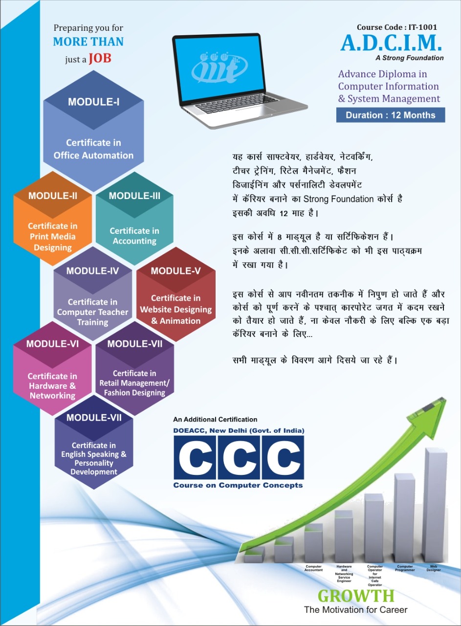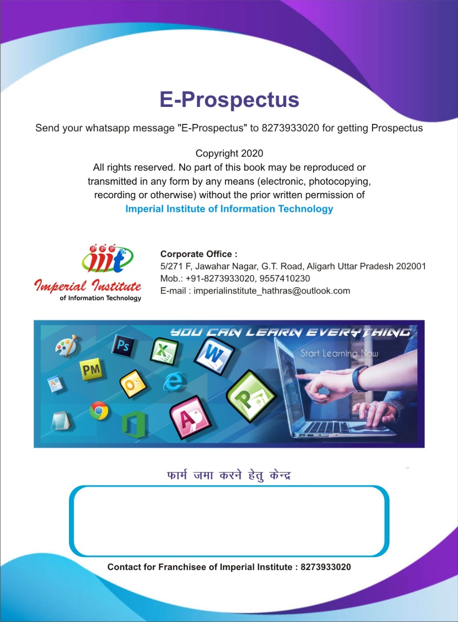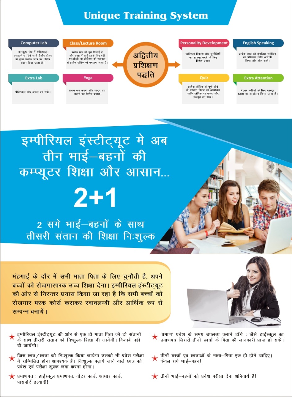 जब आप इम्पीरियल कम्पूटर्स के कोर्स को चुनते है, तो यह निश्चित हो जाता है, कि आप को जॉब या नौकरी की आवश्यकताओं से ज्यादा तैयार किया जा रहा है। व्यक्तित्व विकास, योगा, कम्यूनिकेशन स्किल से और हमारी विलक्षण सिखाने की पद्धति से आपको विशेष गुण मिलते हैं, तो आपका पूर्णता विकास करता है और आत्मविश्वास पैदा करता है। जब आप कोर्स पूरा करने के पश्चात बाहर जाते हैं, तब आप जीवन की चुनौतियों का सामना करने के लिए अस्त्र शस्त्रों के साथा तैयार हो चुके होते हैं।